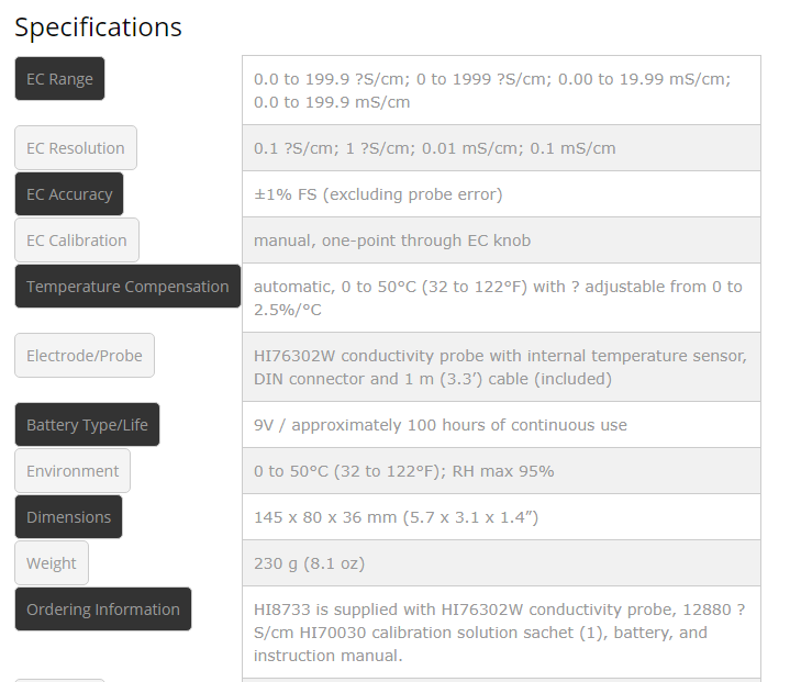 Automatic Temperature Compensation – Since temperature has such a dramatic effect on conductivity readings, having a meter that offers temperature compensated readings is invaluable. The probe of the HI8733 features a built-in temperature sensor that automatically accounts for the effects of temperature on a sample’s conductivity reading in the range of 0 to 50°C (32 to 122°F).