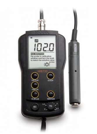 The HI8733 is a durable, portable EC meter designed for use in areas of production and quality control. It is supplied with a four-ring conductivity probe to allow for four ranges of measurement. Conductivity readings are adjusted with Automatic Temperature Compensation (ATC), assuring users of consistent and accurate measurements.